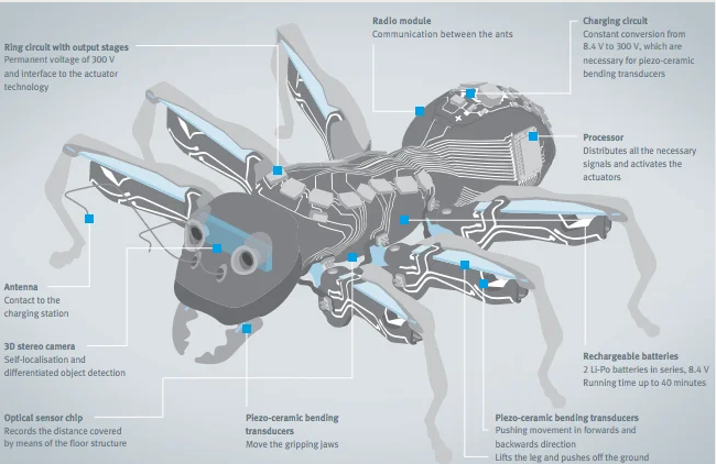 Έχουν ένα σύστημα 3D στερεοφωνικής κάμερας στο κεφάλι τους και οι κεραίες τους λειτουργούν πραγματικά ως επαφές φόρτισης μπαταριών όταν πιέζονται πάνω σε μια ηλεκτρική ράγα. Τα κινούμενα μέρη όπως τα πόδια και οι κάτω γνάθοι αποτελούνται από συνολικά 20 «τριμορφικούς πιεζοκεραμικούς μετατροπείς κάμψης», οι οποίοι κινούνται γρήγορα και αποτελεσματικά, ενώ παραμένουν ανθεκτικά με ελάχιστες απαιτήσεις χώρου.